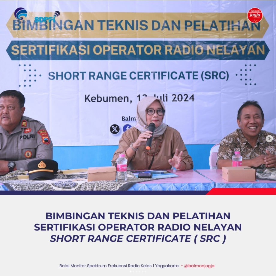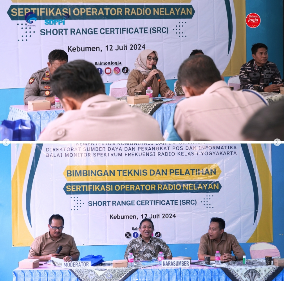 Kebumen (13/7) – Balai Monitor Spektrum Frekuensi Radio Kelas I Yogyakarta dalam upaya mengingkatkan kualitas pelayanan publik di bidang Spektrum Frekuensi Radio (SFR) dan Sertifikasi Operator Radio (SOR) telah melaksanakan Bimtek Sertifikasi Operator Radio Short Range Certificate ( SRC ) bagi nelayan di Kabupaten Kebumen.