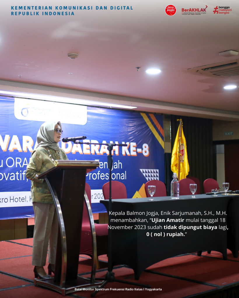 Kegiatan ini dihadiri oleh Kepala Balai Monitor Spektrum Spektrum Frekuensi Radio Kelas I Yogyakarta Enik Sarjumanah, S.H.,M.H. Dalam sambutannya beliau berpesan “Tantangan pengelolaan SFR semakin kompleks, oleh karena itu kolaborasi antara Balai Monitor dan Orari menjadi sangat penting, supaya penggunaan SFR itu tertib, aman, dan bermanfaat untuk masyarakat luas.”